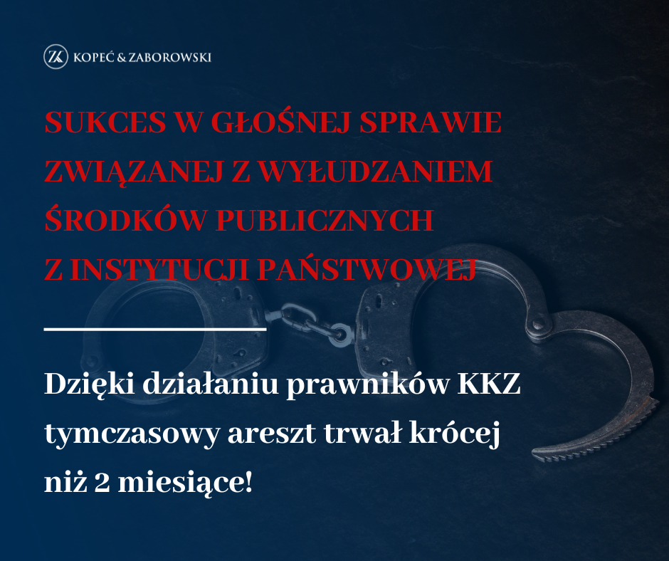 Dzięki prawnikom KKZ areszt w głośnej sprawie związanej z wyłudzaniem środków publicznych z instytucji państwowej nie trwał nawet 2 miesięcy.